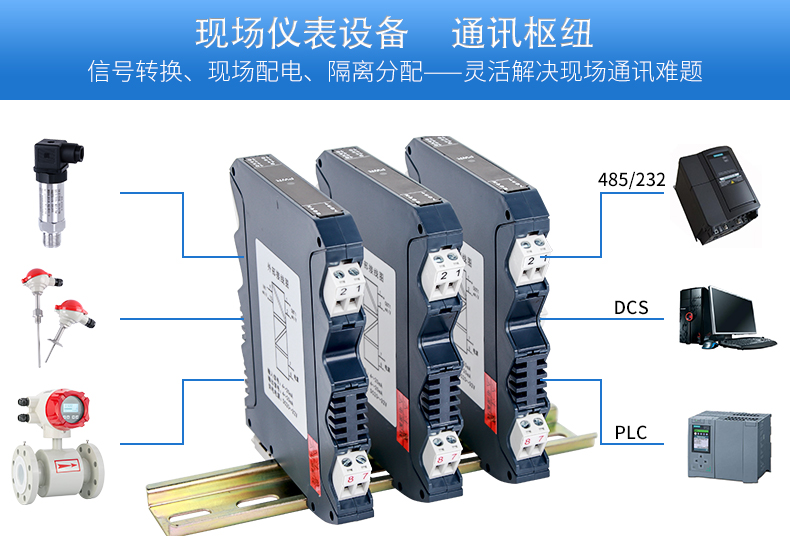 將PT100等熱電阻跟熱電偶信號轉(zhuǎn)換成各種電流、電壓等標準模擬量信號,可以與PC機、PLC、DCS等實現(xiàn)工控監(jiān)測連接??垢蓴_能力強,遠傳不受其他設(shè)備影響。