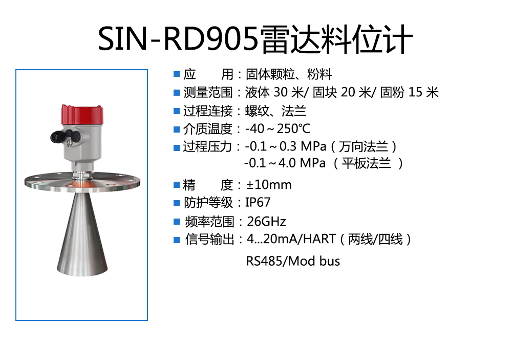 您的位置: 首頁 > 雷達液位計 >SIN-RD905雷達料位計_適用于固體顆粒、粉料_