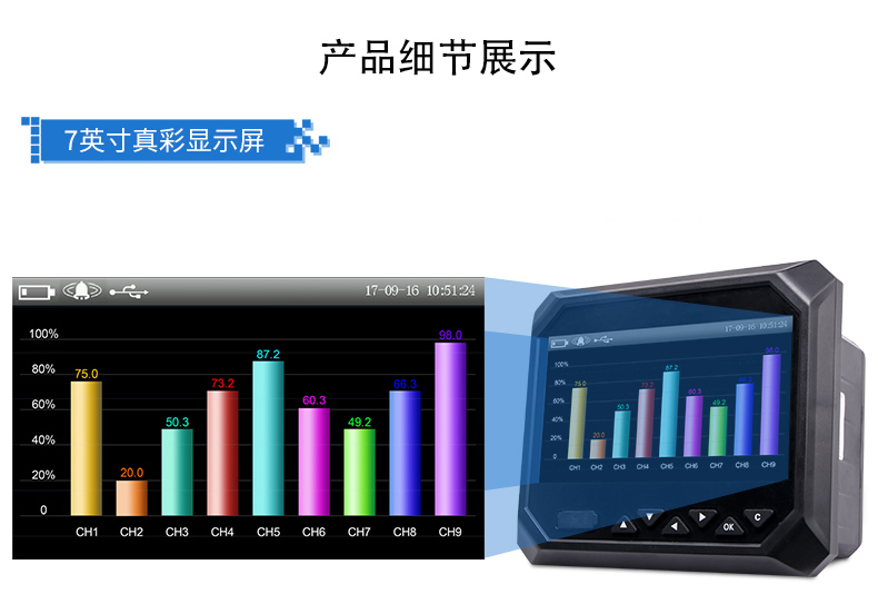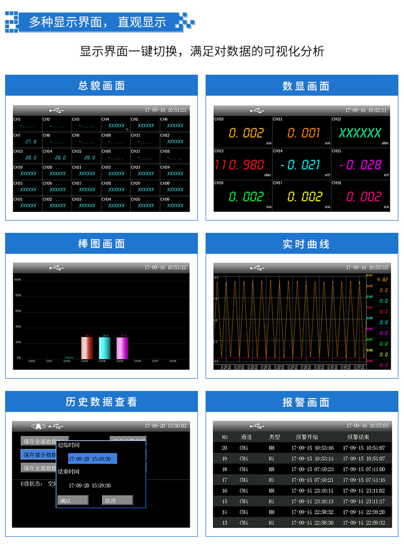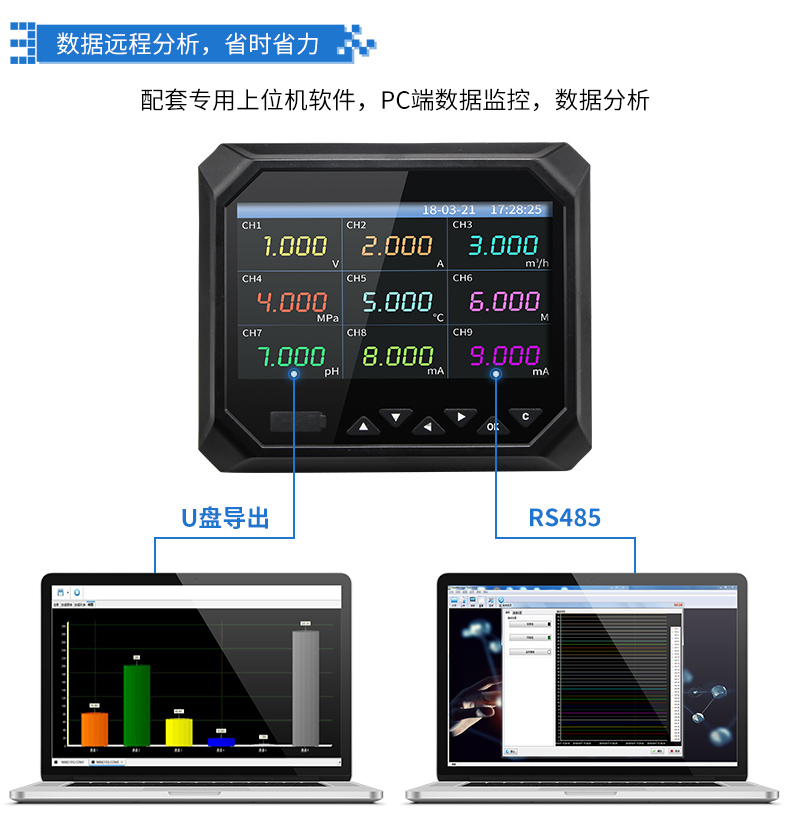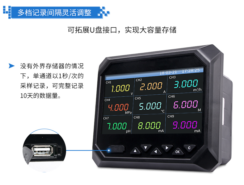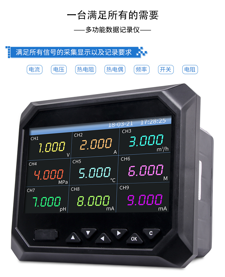 無紙記錄儀是將采集的數據/運算數據以時間為基軸記錄在儀器內部的存儲系統(tǒng)中,無消耗任何常用的記錄設施,如:紙張、筆墨。記錄在儀器內部的存儲數據,通過運算、模擬后顯示在液晶屏。常用顯示用液晶屏比較廣泛。在液晶屏屏幕上,可以顯示數字顯示、棒圖顯示、曲線顯示、報警列表等。無紙記錄儀采集的數據,常用的有:溫度、壓力、流量、液位、電壓、電流、濕度、頻率、振動、轉速等。